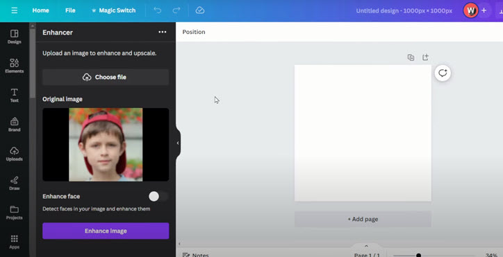 To sharpen an image in Canva, simply create the project as usual, and then click on the Apps panel in the left toolbar. Search for "Enhancer" inside the app. You can then upload photos and make them sharper and clearer, even when enlarged at full screen. Canva also includes a traditional image sharpening tool in Edit photo > Adjust > Texture.