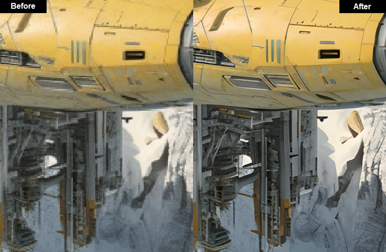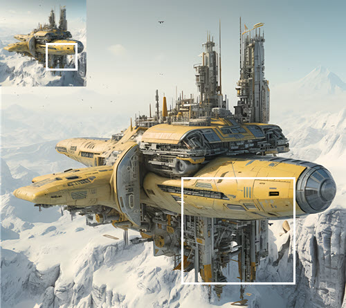 AI Image Sharpening Case 4: Besides sharpening real-world images, VideoProc Converter AI also works for AI art. Above is a MidJourney-generated futuristic spaceship. It can be blurry when printed out as a 60'' wall art. After enhancement in VideoProc, its mechanical structures are clearer. Notice how the once-subtle transitions between mechanical panels are now sharpened, with conjunctions boasting well-defined edges.