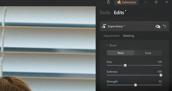 The image sharpening interface maintains consistency with Luminar Neo's photo editing design. Users can utilize masks and brushes to select specific areas for improvement, setting it apart from tools that only enhance the global area of the entire image.
