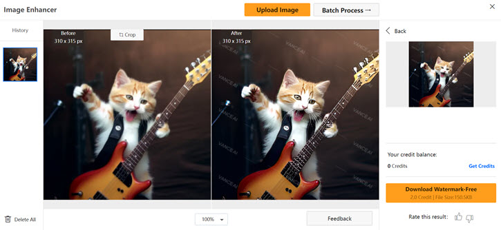 The online AI image sharpening tool in VanceAI requires credits for image processing; otherwise, it will apply watermarks to the image. You can preview the sharpened image in real-time to assess its effectiveness. Based on my testing, the output appears noticeably clearer and sharper. However, upon zooming in, you may still observe blockiness and pixelation. In such cases, it's recommended to use the upscaling feature after sharpening.