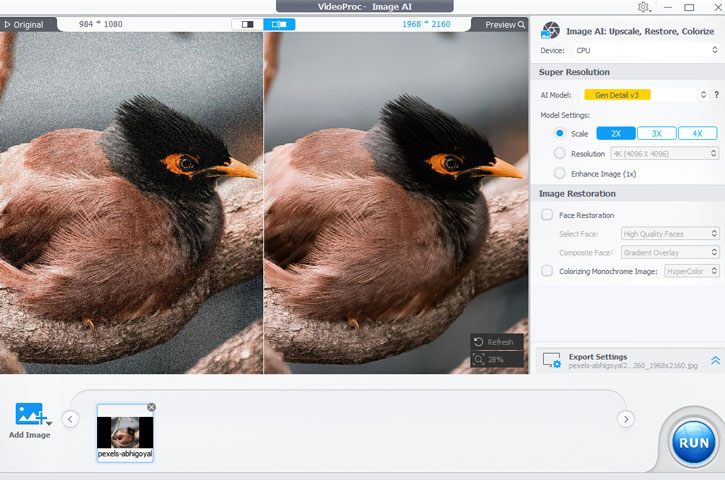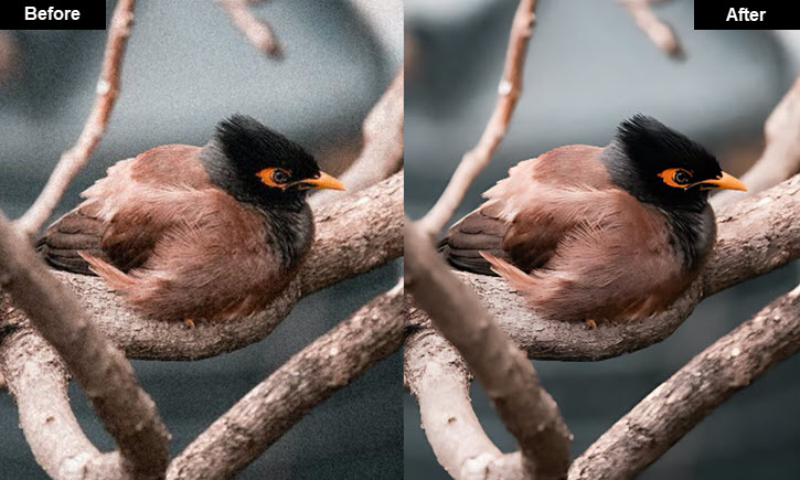Case 5: AI image sharpening and AI image denoising can be handled in one-go in VideoProc Converter AI. The above bird photography suffered from high ISO noises. In a one-step process, the Super Resolution tool in VideoProc delivers a clear output.