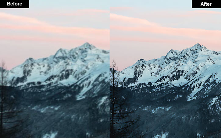 AI Image Sharpening Case 1: Above is a side-by-side comparison of a snowy mountain image sharpened in VideoProc Converter AI. The jagged edges of the peaks, once slightly softened by distance, are now crisply defined against the canvas of the sky. There are also some intricate textures of the rocks not covered by snow. The branches of the trees in the front field are also more contrast-y.