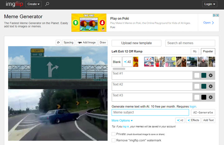 This online tool is dedicated to quick meme creation with hundreds of meme templates, such as Distracted Boyfriend, Drake Hotline Bling, Drake Hotline Bling, etc. Its classic model allows searching meme templates and customizing captions on them. While the ChatGPT version is mainly employed to write meme texts. This feature is currently accessible through Imgflip's paid plans because of the expenses associated with using the OpenAI API. However, there may be some free access available in the future.