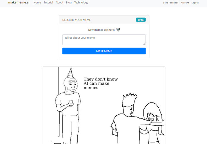 This is an online AI meme generator that you can create and download memes for free. Fueled by OpenAI GPT-3 and NLP, it chooses a relevant meme template according to your description. With a deep understanding of your input, it rewrites it to a witty caption for the meme.