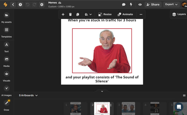 Simplified is an AI-based online design tool that can make memes, graphics, thumbnails, carousels, and even videos. Just input your topic in simple words, and you'll see it generating witty and funny captions on classic image memes. One distinguishing feature is that Simplified allows you to choose the tone like professional, optimistic, sad, etc., so generating appropriate captions. Moreover, it supports memes in 25 languages.