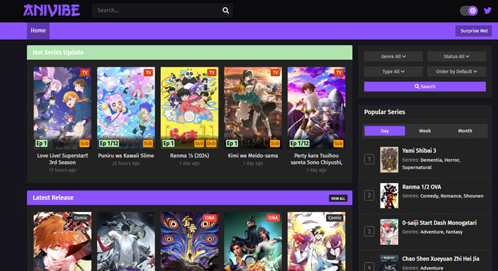 Anivibe is also a popular alternative to AnimeSuge for anime streaming. With a well-organized interface, it offers detailed labels for over 30 genres, making it easy to filter and find exactly what you're in the mood for. If you're feeling adventurous and can't decide, the "Surprise Me" option randomly picks a title for you.