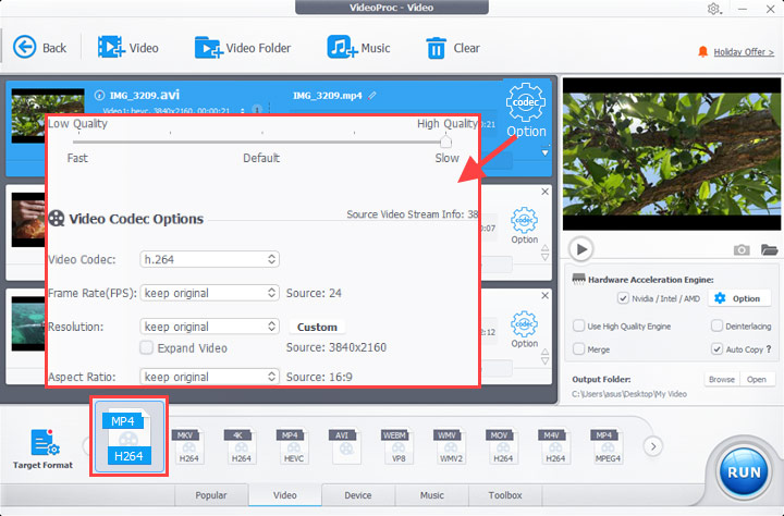 VideoProc Converter AI has a wide spectrum of video decoders and encoders and can not only play AVI of various codecs but also transcode them into formats friendly to Windows, Mac, iPhone, iPad, Xbox, YouTube, Facebook, and many more. Benefiting from its Level-3 Hardware Acceleration, video processing speed reaches up to 47x faster in real-time.