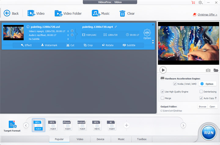 VideoProc Converter AI starts converting your AVI files to MP4 when clicking the RUN button on the main interface. Don't forget to toggle on the Hardware Acceleration and the High Quality Engine options.