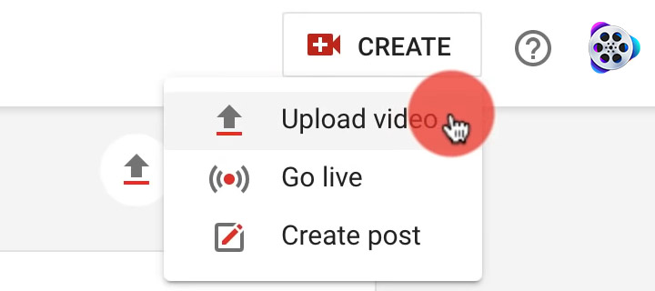 - Click the camcorder icon in the upper right corner and select Upload video.