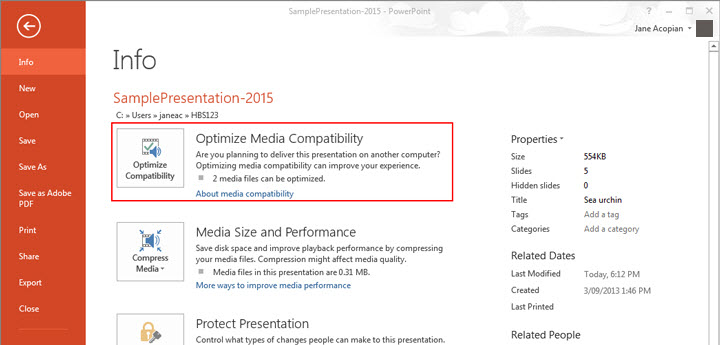 Step 3. If PowerPoint identifies any incompatible media files, the "Optimize Media Compatibility" button will appear within the "Info" section.