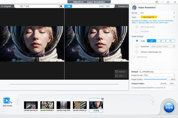 As the best AI-driven 4K image upscaler, VideoProc Converter AI uses the latest AI technology to upscale images by 200%, 300%, or 400% to 4K/8K resolution. Unlike the transitional upscaling methods that use mathematical algorithms which often lead to pixilation and loss of details, VideoProc Converter AI leverages advanced AI-based neural network technology to seamlessly convert low-resolution anime, photos, posters, prints, portraits, landscape images, and more to 4K/8K while preserving as many details as possible.