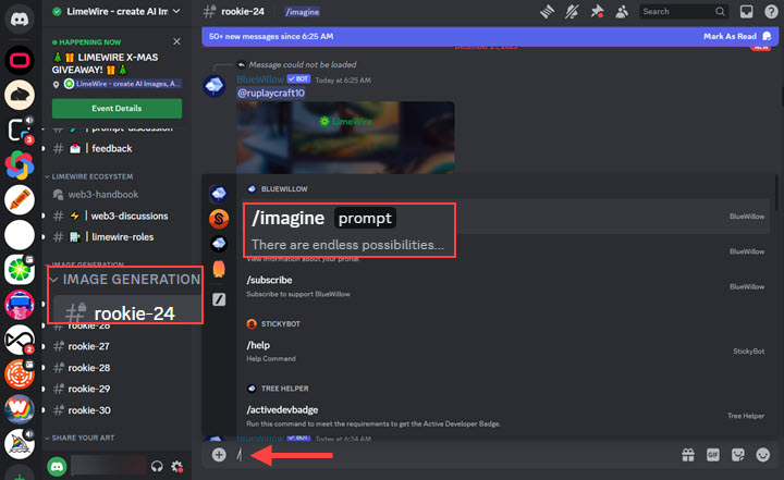 Step 2. Open a #rookie bot, put "/imagine + your textual prompt". Send it to the LimeWire AI image generator bot.