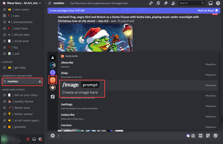 Step 2. Start a message in #newbies. Input a slash, click the Maze.Guru icon, and choose "/image". Then type your prompt.
