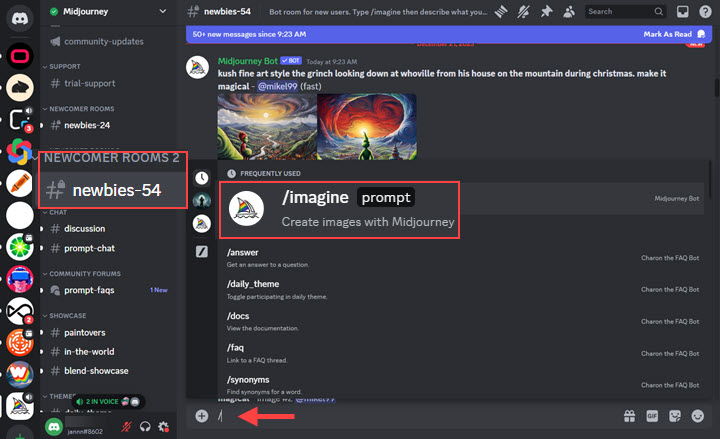 Step 4. Open a newbie channel on the left column. Input "/imagine" to activate its AI art generator on Discord.