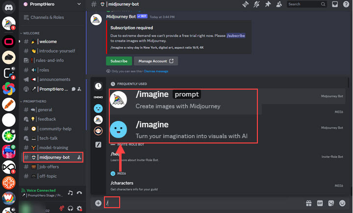 Step 3. Type "/imagine" in the message box. Choose an AI art generator bot from Midjourney or MEE6.