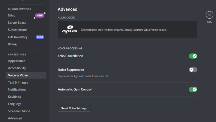 Step 2. Scroll down on the pop-up Settings panel to find Voice & Video. Select Reset Voice Settings.