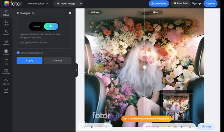 Some online image processing tools now utilize AI algorithms to upscale images. For example, Fotor. It allows for both creative enhancements and fundamental changes. It is accessible to anyone for free online and can be used by uploading images from a computer or pasting the URL of an image from the internet.