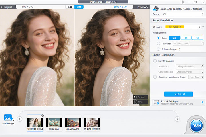 Step 2. Select the AI model — Gen Detail v3 and Real Smooth v3 are the most popular choices. Then, set the output resolution by selecting an upscale ratio, such as 2x or 4K. Alternatively, you can directly choose a target resolution or manually enter the pixel dimensions. You can right-click on the image file at the bottom to apply the upscaling settings to the rest.