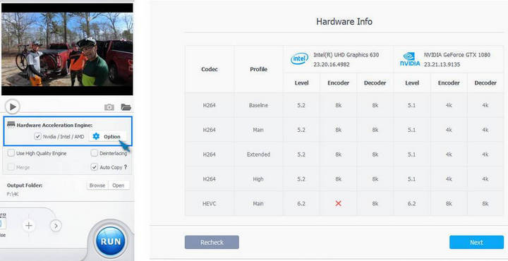 Once you have it installed, you'll have to go to the settings to set hardware acceleration. Look for "Option" near "Hardware Acceleration Engine" and then go to "VideoProc Converter AI - Video." Click "Option" again and adjust your desired settings.