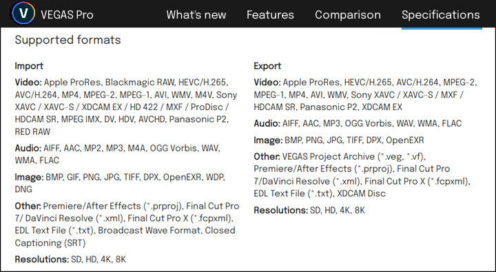 You can find more information about compatible audio, image, and others in Vegas Pro's official specifications.