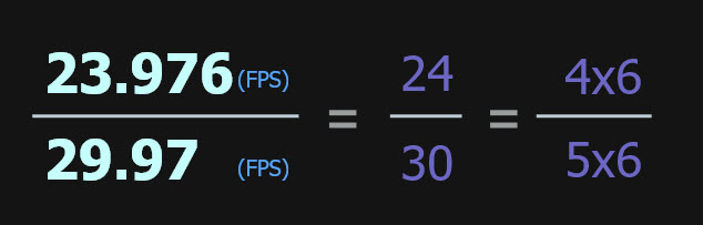 Now that TV adopts 29.97 FPS, 24 FPS has to be changed accordingly, and that would be 29.97x 4/5 = 23.976. Similarly, devices that record in 60 FPS becomes 29.97 x 60/30 = 59.94.