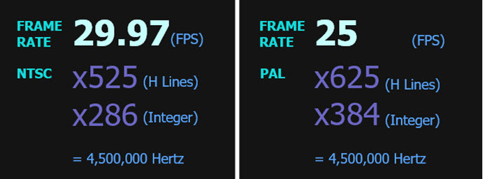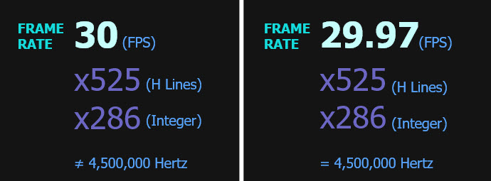 It leaves us two options, changing the number of horizontal lines scanned or changing the frame rate. RCA engineers opt for the FPS adaptation, and that's how 29.97 FPS comes from: 4,500,000/(525x286)=29.97, where 286 is the integer, and 525 is the horizontal lines, which remains the same number as used in old black & white TV.