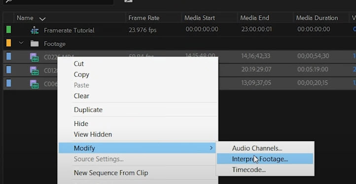 To interpret the footage, you simply right-click on that clip in the resource bin, and click Modify.