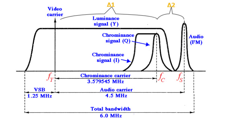 - Frequency difference between color and luminance: Delta Δ1=fc-fy