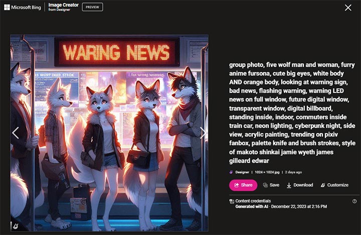 Bing Image Creator is a free furry AI art generator powered by DALL-E 3, the latest text-to-image model from OpenAI. It promises better precision and reliability and generates photorealistic, coherent, and aesthetically pleasing images. From a beginner's standpoint, Bing Image Creator is quite intuitive and simple to use. It can be used directly from a web browser without any downloads. To create furry AI images, log in with a Microsoft account, enter a text prompt, and click Generate. Then you'll see four images based on your description.