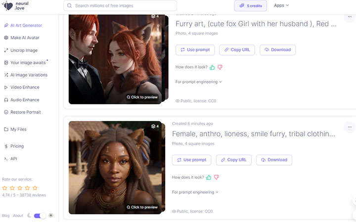 Neural Love is an online FSW and NSFW AI image generator for furry art, avatars, and so on. You can convert descriptions to furry images as well as restyle realistic images to fursonas. It utilizes NL1.0.3, the model developed by its R&D team, DALL-E 3 from OpenAI, or custom models via APIs. Notably, it can generate up to 20 furry images at a time, and lets you hide NSFW furry images from the public with the Safe Results filter.