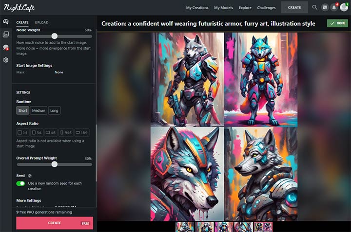 NightCafe is a popular AI art generator supporting a variety of styles and techniques including furry artworks. This platform creates furry images visually appealing and anatomically correct with 27 AI models, such as SDXL 1.0, DreamShaper v8, Mysterious XL v4, etc. Meanwhile, you are allowed to customize the furry creations, including species, poses, body types, and clothing. In addition, NightCafe can make furry art in the style of anime, 3D, modern comic, dark fantasy, portrait, cyberpunk, and beyond.