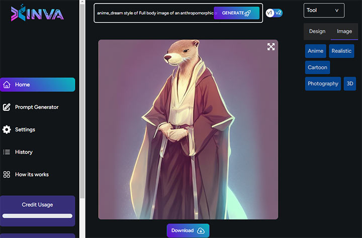 Xinva Ai Furry Art Generator is an online tool good that enhances productivity with deep machine learning technologies. It's good at making anime, realistic, cartoon, photography, and 3D furry images. You can create images by inputting imaginative ideas into the prompt box or modifying its well-researched prompts.