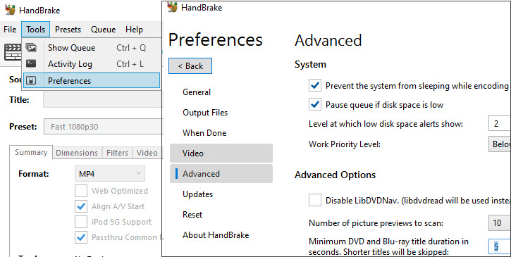 Step 1. Launch HandBrake and go to Tools > Preferences > Advanced.