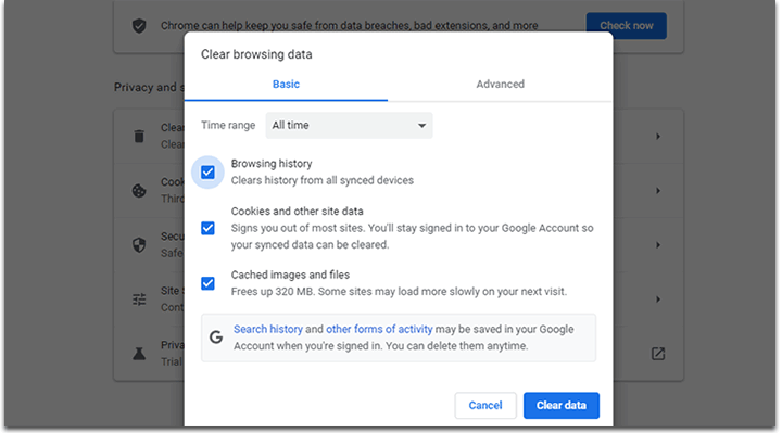 Step 2. Select Clear browsing data. On the new page, hit Basic, and choose All time for the Time range option.