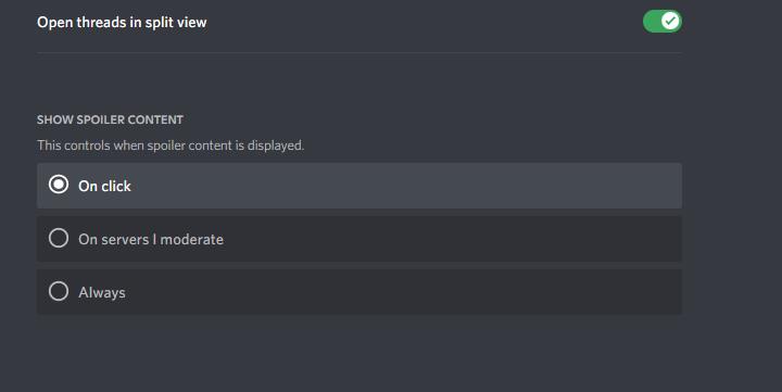 - On Click: this hides all the spoiler tags even in the servers you moderate. And only when you click on the spoiler tag could you reveal the content beneath.