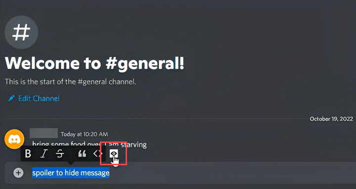 Step 2. Type the words in the chatbox, select the text, and in the floating bar pops up, click on the eye icon, and upon that, a double vertical lines '||' mark will automatically surround the text to mark the message as a spoiler.