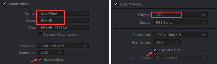 - Choose QuickTime format with DNxHR codec if you want to export a video with alpha channel in DaVinci Resolve. Choose TIFF format for the transparent image.
