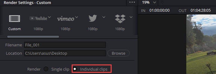Again, we are on the "Deliver" page. Choose "Individual clips" in the "Render" option. This is going to render each clip in the timeline separately (as opposed to an entire video).