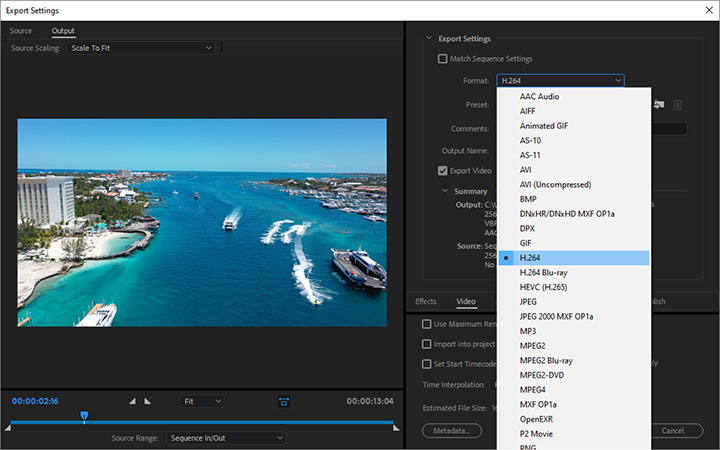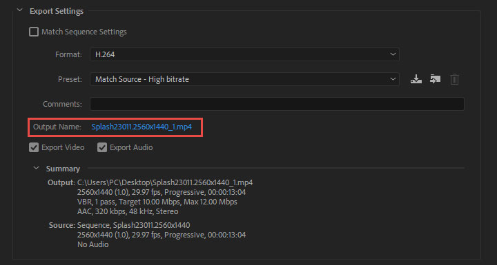 - Go to File > Export > Media to bring up the Export Settings panel.