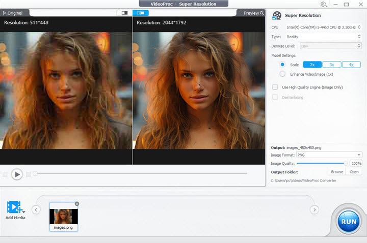 As a groundbreaking picture enhancer powered by advanced AI Super Resolution, VideoProc Converter AI can effortlessly make a blurry picture clear, reduce unwanted graininess or noise, and upscale low-resolution and old photos into stunning HD/4K quality on Windows.