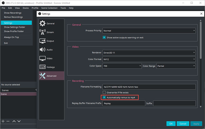 However, making OBS record in MP4 is prone to errors. That may cause stability issues since MP4 requires finalization before the video is playable. If the recording is interrupted for any reason, the file may not be recoverable.