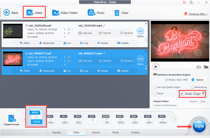 Step 3. Check 'Auto Copy' for 1:1 SWF conversion if you prefer the original .swf file quality without re-encoding. Click Run to convert and play SWF files on Windows and Mac.