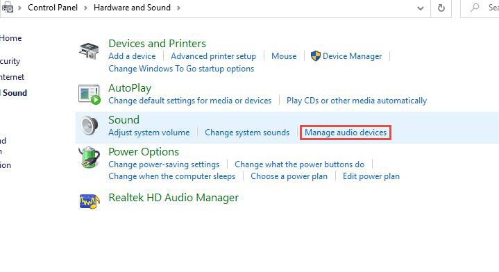 Step 2. Find Manage Audio Devices and enable the default Mic