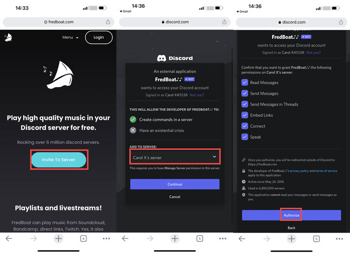 Now the Freboat bot is added to your Discord mobile server, and type the command required to play music on Discord mobile.