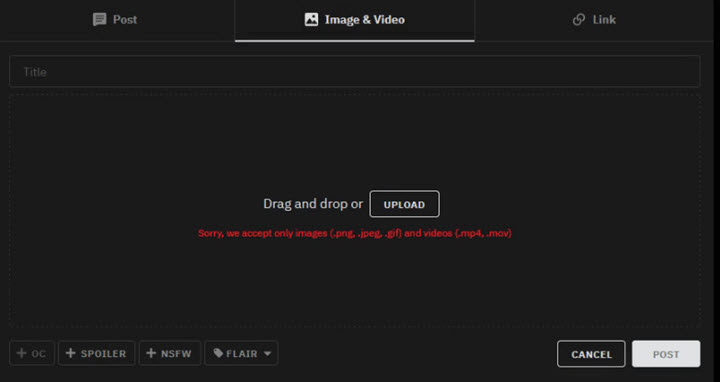 It's simple to follow the steps above to upload a video to Reddit, but many users still suffer from unexpected errors and upload failures. For example, when you drag videos to the new post area, it says "Sorry, we accept only images (.png, jpeg, .gif) and videos (.mp4, .mov)" or "Failed to upload media".