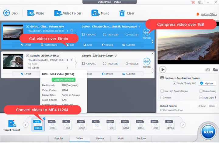 After figuring out what videos can be uploaded to Reddit, you just need to tweak several video settings according to the list above. And thankfully, all of these settings can be finished in one application, VideoProc Converter AI. It's a handy and versatile video processing program able to convert video to MP4 and MOV encoded with H.264 for Reddit, cut long videos into clips under 15 minutes, and compress MP4 and MOV files that exceed 1GB easily for Reddit, as well as download videos from Reddit.