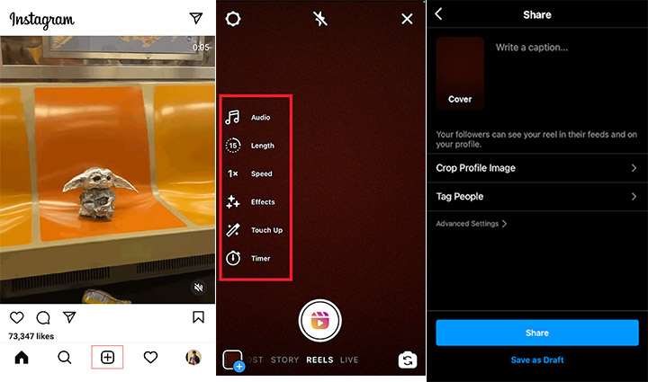 Reels can be up to 90 seconds long, giving you more flexibility to share a story or showcase your content compared to Stories, which disappear after 24 hours.