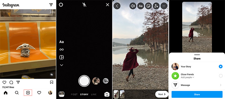 - Open the Instagram app and tap the + icon or swipe right from your home screen to access the Story feature.