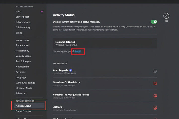 Go to the User Settings at the bottom left > Activity Status. Under the 'No game detected' message, click the Add it link.