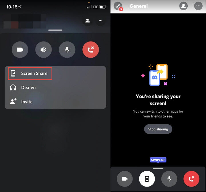 Step 3. Select the 'Join Voice' button, then swipe up to reveal the Screen Share option, and tap on it to start broadcasting your phone screen.